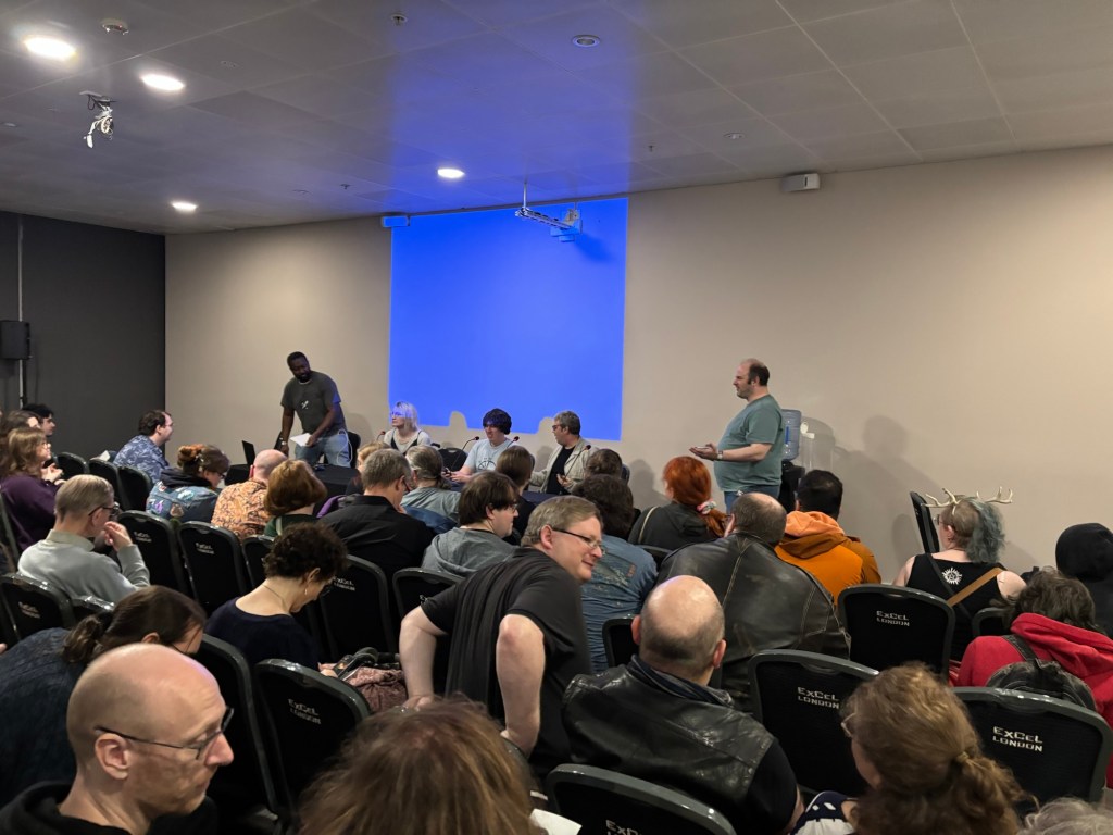 While it feels like a terrifying experience up front, I found it pretty exhilarating to do. The people were all nice and the panellists were genuinely interested in the pitches. Paul Cornell was very thorough in his attitude towards what a Future Shock needs. Rob would get folks to go back and elaborate on some elements, freed from the two minute pitch time. Leah picked up some fun hooks and genuinely seemed to enjoy a lot of the suggestions.
