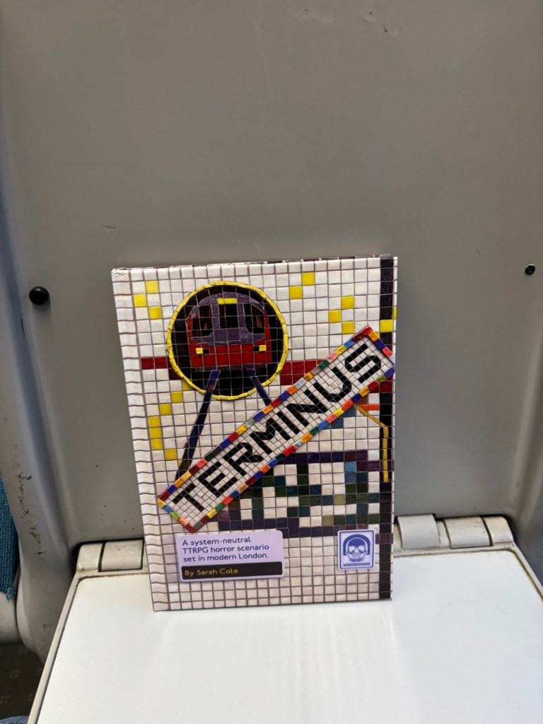 Sarah was selling her system-neutral horror RPG scenario collection Darkened Hill and Dale, which I’d resolved to pick up after seeing her at a folk horror talk at UK Games Expo this year. Terminus was making its debut at the con, with preorders for folks who didn’t want to pick up one of the few copies and carry it home. This is a London Underground-based system neutral horror book which has a gorgeous cover made using tiles. The original even accompanied Sarah to the con.