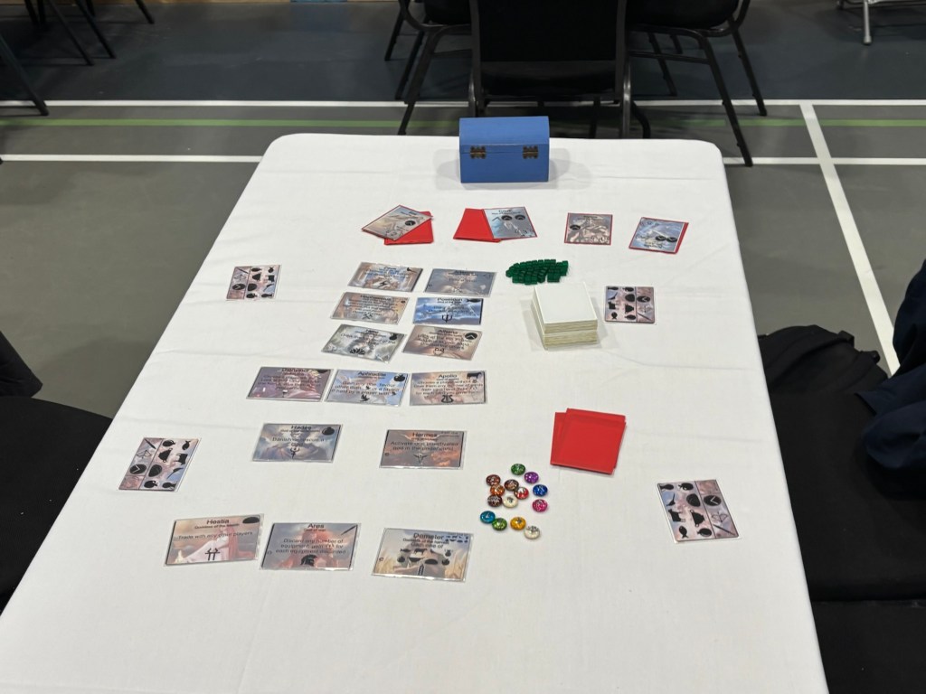 There was a selection of tables with designers trying to summon players for unfinished games or to demo complete ones. It was here where I met an old friend, Jacob Collins. He was testing out a game he co-designed with his son, called, “Mount Olympus”.