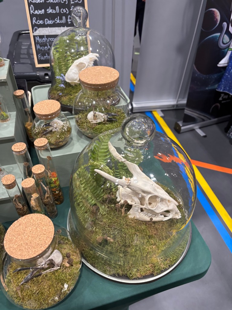 Layla Pitts had a selection of bottled curiosities. There were small plants and skulls, each of which looked gorgeous. Admittedly their largest work for the con had already sold, but these items still looked very nice.