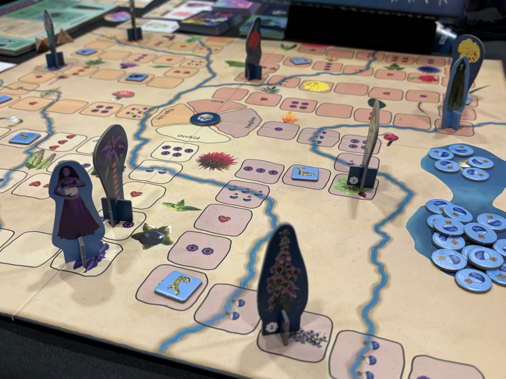 Players are dryads trapped in a dimension filled with hostile plantlife chasing them as they try to flee. There are four tracks for the different dryads and abilities to select from their player boards. You can also get animal helped which includes the designer’s cat (and admittedly an owl, a creature I irrationally hate). There are story cards to advance things which is good, as the designer felt overflowing with ideas about this weird world.