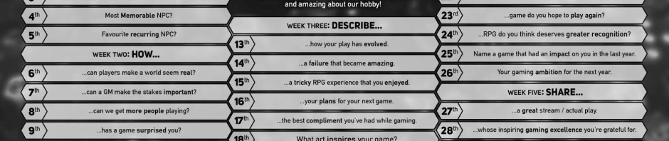 I find it a mixed experience. I know I find it a fun trip down memory lane, digging up experiences I’ve had at the table which I’ve completely forgotten about. At the same time I know others haven’t all had similar experiences with the questions. The question which really got to me last year was about RPG reviews. A lot of people, especially designers, were talking about how they didn’t place much merit in them. It got me questioning what I was doing and why I was doing it with Who Dares Rolls. What I’d been doing was a series of Actual Play reports, which generally took a while to compile and translate from my notes, along with a review of the game which would be in among the opening articles and the conclusions. The latter half of the 7th Sea game I was posting has been written, but not put up. I’ve not yet got round to writing up my experiences of Blades in the Dark, Masks or my more recent 7th Sea and Dungeon World campaigns. I’m still not sure what to do with any of that.