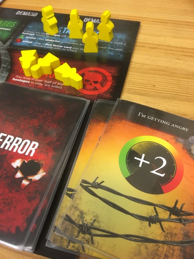 I’ve played through the original Hostage Negotiator a few times (once I’ve done the new abductors I’ll return to the originals as I have bonus cards for them) and expected these three to be pretty similar. So far they’ve not, with Lijah not having a plan but wanting to escape. That was a good way of easing us into the game. Now we’re in pretty deep with a character who’s already at the end of the threat scale, having just killed a hostage. This is going to be tricky. I selected The Rock as my negotiator as she’s a great person to gain a sudden boost of conversation points when you hit crunch time. I’ll change up who I’m using at some point. Just not today.