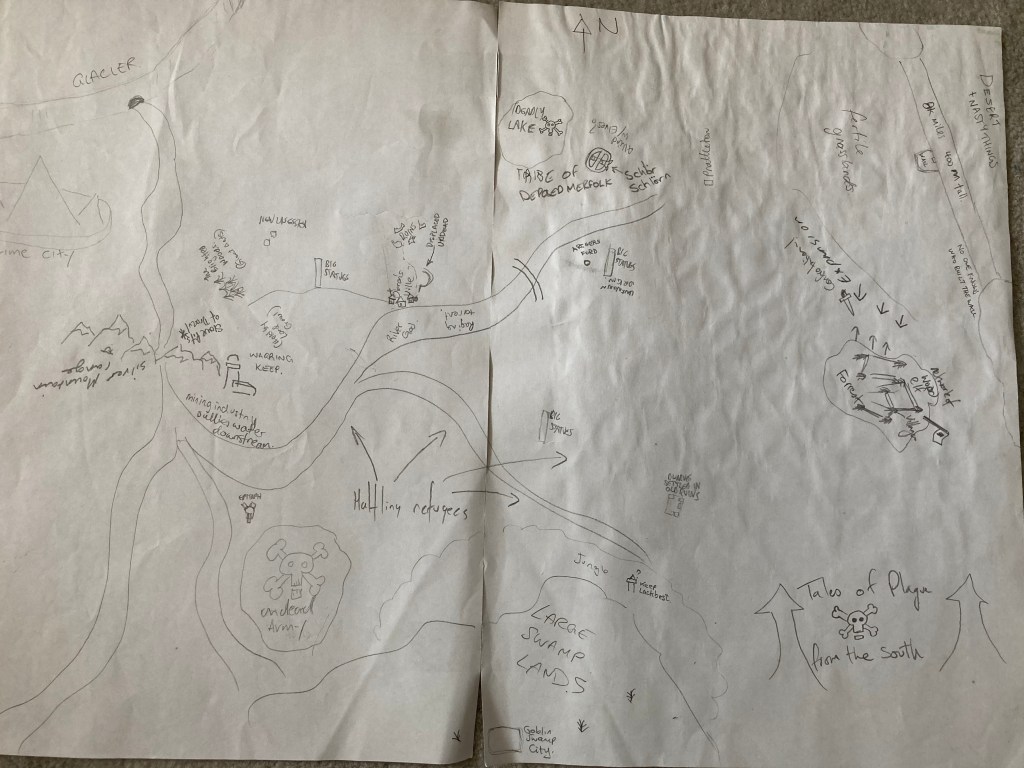 An example is the Wall campaign I ran using Dungeon World. We started out with the world. I had a bit of paper with a wall a thousand miles long, with a capital city at the centre point. Beyond it, only desert and demons. I asked each player to add a landmark, a civilisation and a mystery, doing the same myself after each of them had a turn. That loaded the world up with interesting things we all pitched in, then we were ready to make characters. In making the characters, the players were asked a lot of questions, like what it meant to be a paladin in the world, where people learnt magic and so on. By the end, we had a world which we’d all contributed towards which felt deep despite only having existed for a few hours.