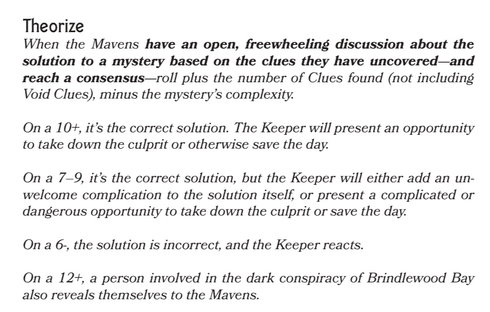 The GM in the game creates or uses an existing scenario, but they don’t know who the murderer was. They interact with the suspects and the world, meddling and doing cosy moves as they go. The GM will have a list of clues, not specifically leading to any one suspect. Players may interpret where and how they’re found and GMs can skew them towards or away from someone. After the players think they’ve got enough clues they can make a Theorize move which looks like this: