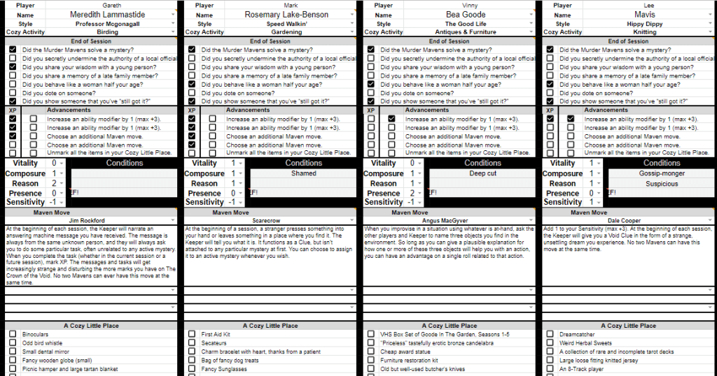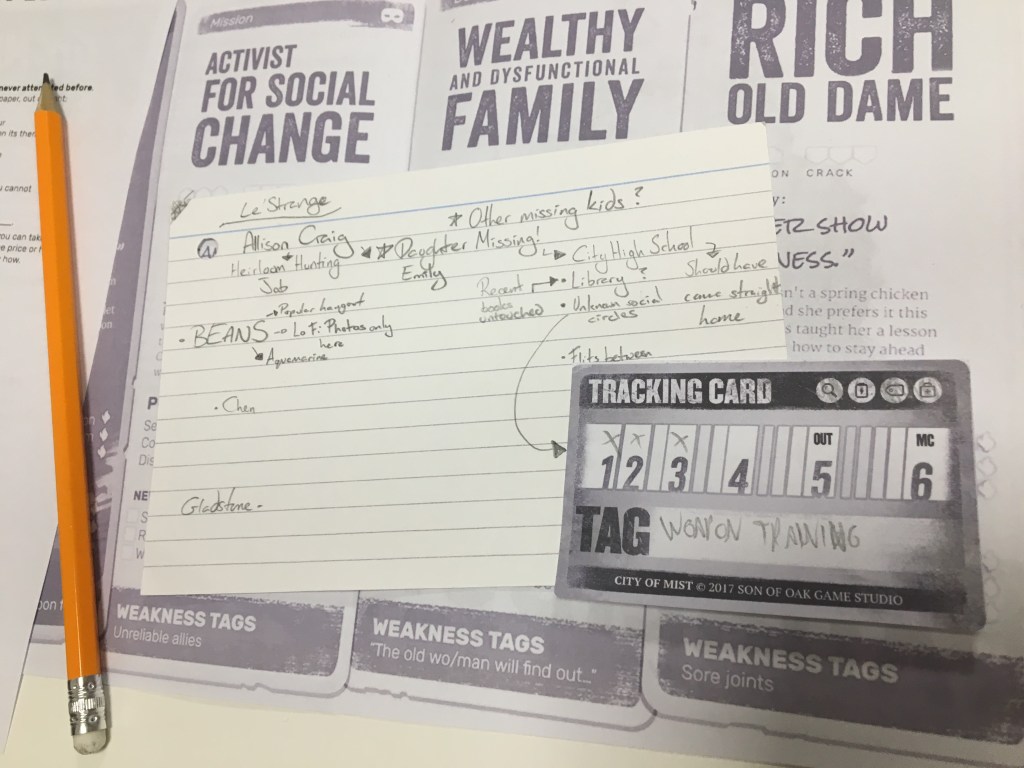 The game has mysteries which have a setup, murder and some leading questions to help the players frame things. Then the Keeper has a list of clues and locations, but not the answer to whodunnit. Instead, you seed clues based on the ‘Meddling Move’ the murder mavens perform, fitting them into the scene. The players then work out how to link the clues together and make a Theorize move which will, more often than not, be the correct answer.