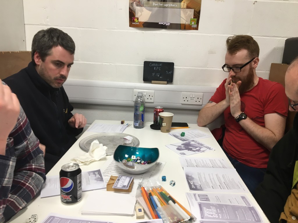 This is one of my favourite RPGs and the first Forged in the Dark game. It’s about carrying out heists in a grimy, haunted city. I took part as a player in a one-shot, making a whisper who was too friendly with ghosts had some rough times trying to grip onto the side of a boat while summoning the drowned dead to cause a distraction.