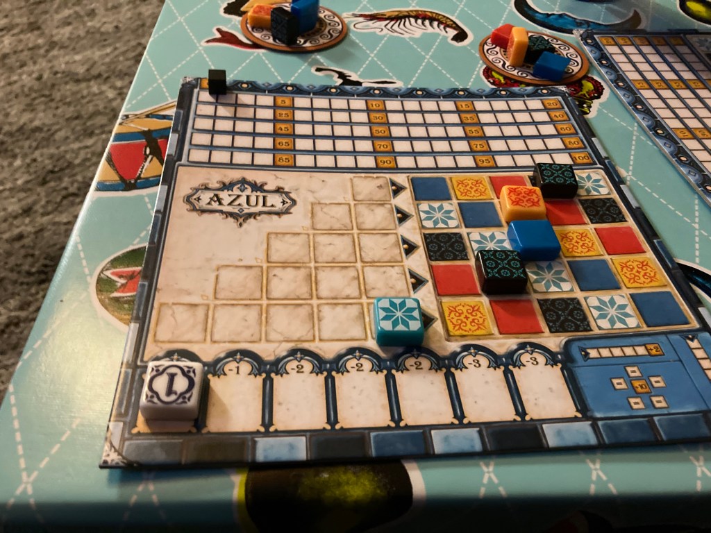 A tile-laying game which feels like it could almost be a phone puzzle game. It has the most beautiful, tactile playing pieces which you take from sets in the centre of the table, trying to pin your opponent into having to make bad choices or possibly ‘breaking’ their tiles if they can’t place them. I thought I did well and hadn’t noticed Emma racking up several columns full of tiles before ending the game. Still, I don’t care, it’s too pretty a game to have a problem with.