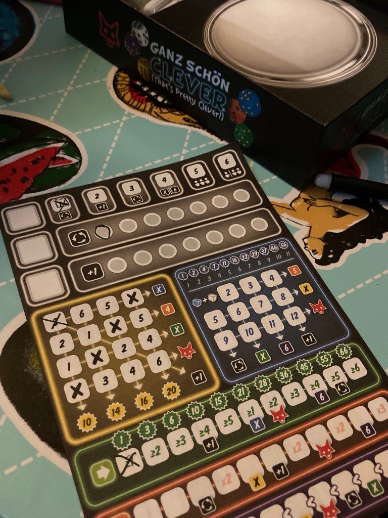 This was my first roll & write game, which I played a lot, then put away for ages. Like Ganz, this is a game where you roll some dice and jot things down, but in this game it’s railway tracks and roads, trying to make connections. We played using the river expansion which I managed to do some fun things with. This is another solid keeper, even though the dry erase markers may need replacing as some are in bad condition.