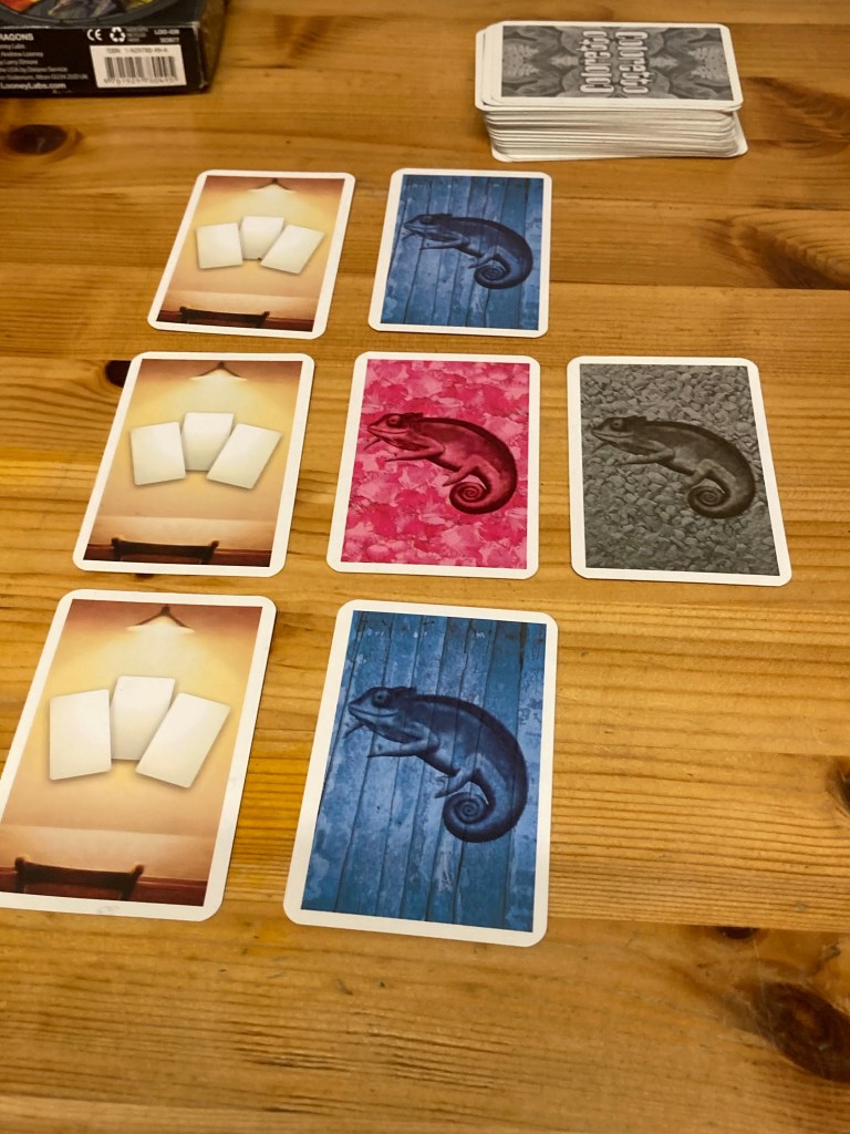 I always forget how nice this game is. You have [player] amount of rows and fill them up with colourful chameleon cards which have textures on them which would help colourblind people. You have to draw and add cards or take them, meaning you’re likely to get very little of what you want, or a lot of potential chaff. Only three colours score you points, the rest remove them.