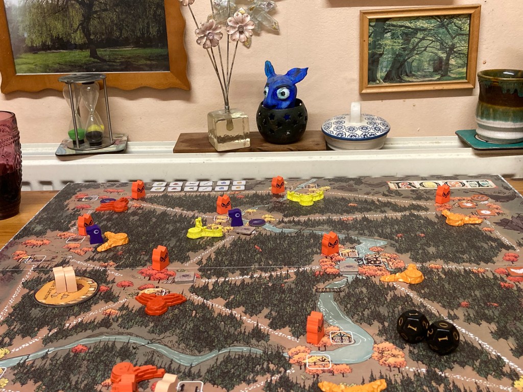 This is a game I love, but it’s been so long I managed to mess up some rules. You play adorable little animals represented by wooden pieces, while they asymmetrically have ways to slaughter each other and win the game. Lee played the Marquis de Cat who controlled most locations to begin with and need supply lines to harvest the forest, eventually filling it with their buildings. Emma played the Underground Duchy who were trying to sway over their ministers while sending groups of moles out through burrowed holes. I played the Corvid Conspiracy who laid traps and hid, hoping for them to go off.