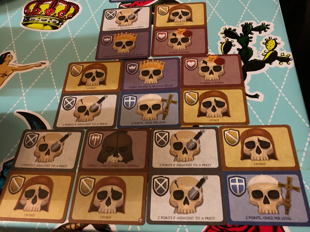 Emma saw a game with skulls being reviewed on Shut Up and Sit Down, so we now have a game about skulls. Specifically you’re trying to build a catacomb with a pyramid of skulls, all of whom need to be placed in certain ways. Nobles want commoners underneath them, criminals want to be next to priests and priests want to be alone on each level. It’s a Button Shy game, so it consists of 18 cards and has a tiny expansion. It was a neat little game.