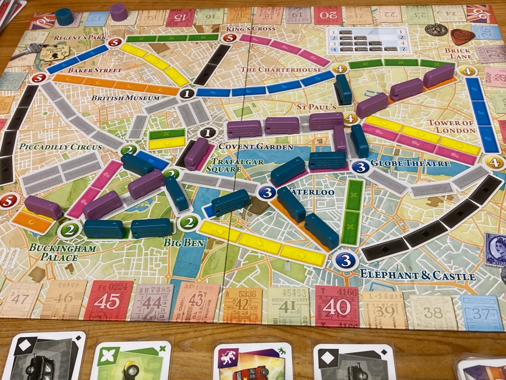 You’re all collecting sets of coloured cards (also with symbols for the colourblind), then cashing them in to lay your trains down on spaces on the board. You’re aiming to make connections between stations across the board and score some extra points for the longest trail across the board.