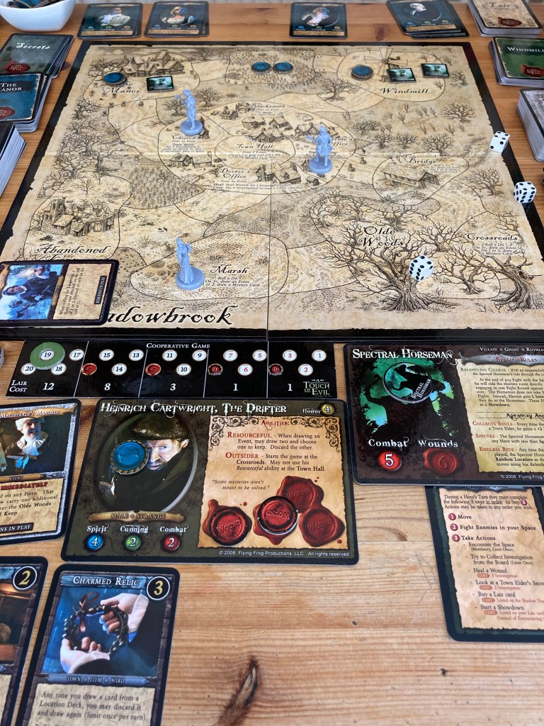Gameplay consists of rolling to move (I know, bad) and then taking an action, which could be investigating one of the locations in or out of town. It’s a game where you know how much you can arm yourself, but you’re never quite going to be as ready as you’d like when it’s time to face the monster. My vagrant was great as collecting event cards to play, but shunned in town. We started with some terrible luck, seeming to constantly get waylaid in fields in the middle of nowhere, but by the end we were an incredible monster-fighting team. One day I’ll get some expansions for this, but it’s pricy enough that I normally just keep an eye out at bring and buy stalls.