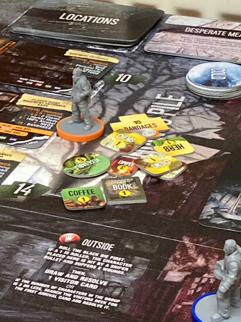 Emma didn’t care for the theme, which is understandable, so Lee and I spent an afternoon playing this when she was away. It’s a long game and we had a really good start, realising some rules we’d missed about the scavenging phase. Unfortunately the trauma of the group snowballed and while they managed to survive the first death, the second caused the third pretty much right away.