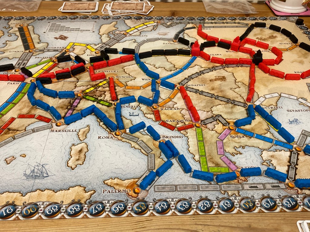 Emma and I saved the larger Ticket to Ride I own for when Lee was around, as it’s always more fun with more players. Ticket to Ride: Europe adds a couple more mechanics than the original game, which I’ve never actually played but feel it would be a real step back from here.