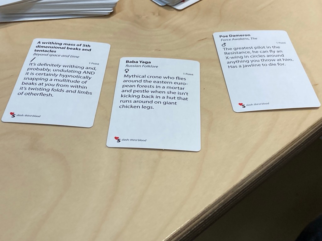 A talking bullshit game about pairing up characters from the popular culture. You put forward someone like, “Fox Mulder” and the other players put in who they think would make a good romantic match. Those are shuffled up and the judge decides who would make the better pairing. It’s more engaging than Cards Against Humanity and causes a lot more discussion over who would be the better suitor. This is the standalone sequel, so we added a bunch of Slash 1 characters and a few new ones using blank cards.