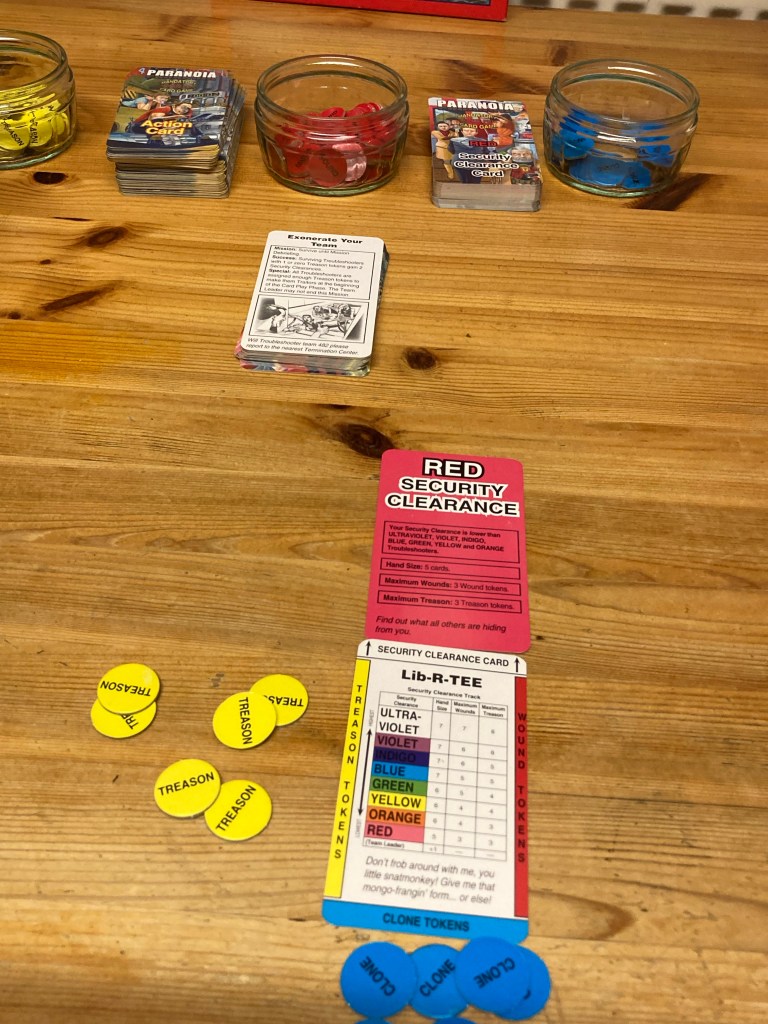 I love the Paranoia RPG, so years ago I bought this game. You have one team leader and a mission each round. You can do the mission and try to get the success conditions, but you might want to purposefully fail to wreck the team leader’s reputation, or simply start shooting at each other. It’s chaotic and fun, but has the Mongoose level of quality and has since been superseded by other games.