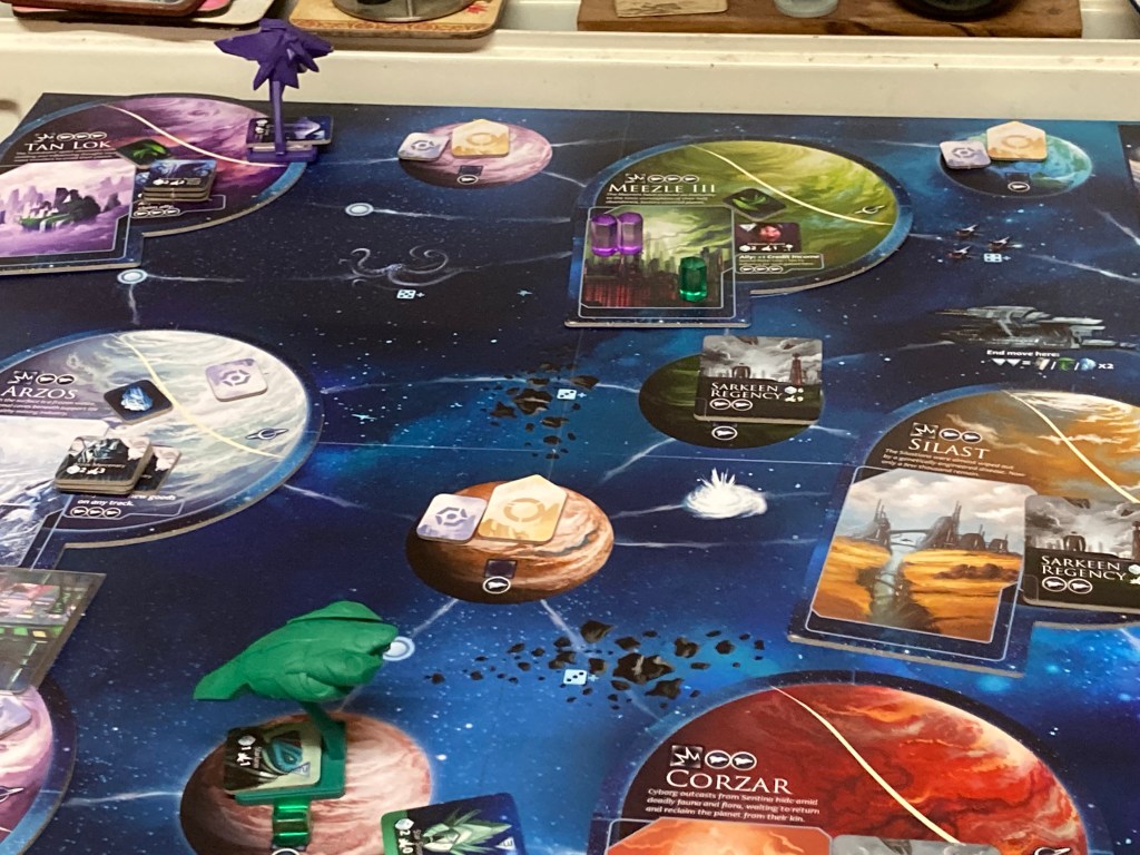 Our game was fairly peaceful between the players, even though it got brutal on some of the planets. Lee conquered a few places, although he left one planet alone when a kaiju escaped from a zoo and started wrecking things. I managed to send some scouts out to rescue people from a crash on a snow planet.