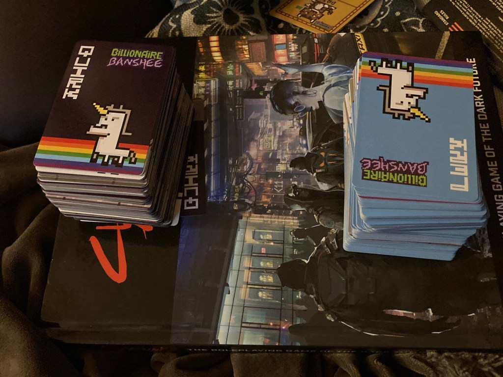 Billionaire Banshee consists of a couple of decks made of ‘perks’ and ‘quirks’ ranging from normal to explicit to fantastical. These are combined to make a date for someone. The mode I tend to play with them has one person judging while everyone tries to sell a person with a randomly drawn perk and quirk to you. It’s kind of Blind Date but where you’re trying to sell a cyborg crime fighter who also steals your tears while you sleep.
