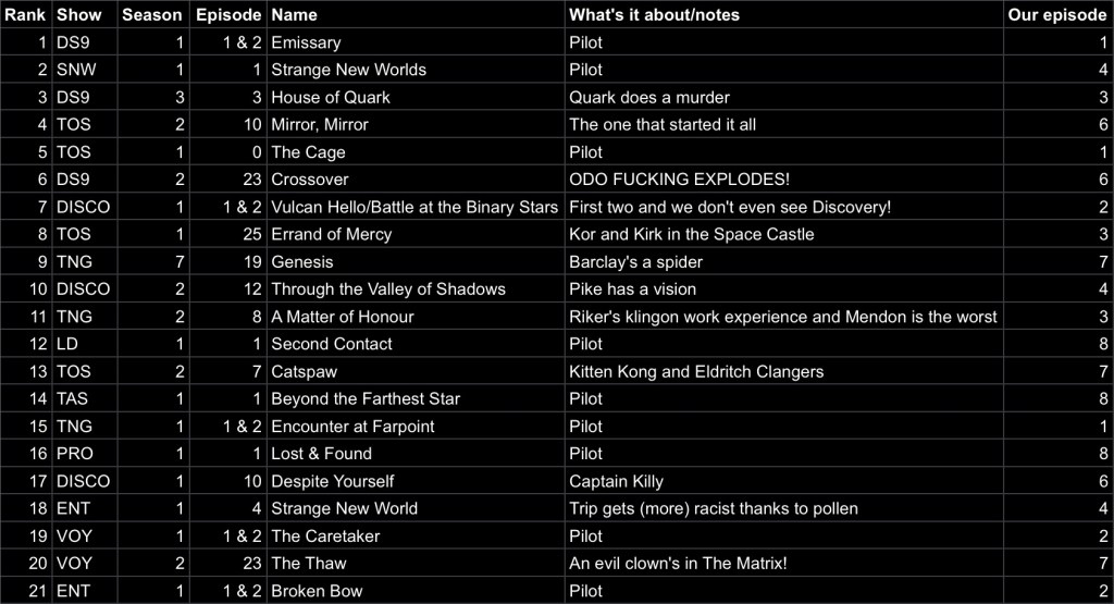 There are so many Star Trek shows now. It’s incredibly cool, as someone who got into it back when there were four, only three of which were in rotation on the few channels we had. When Miles and I were talking about Casual Trek and the premise of watching three episodes from different Star Treks at a time, we pondered the animations. It was enough having a two-parter to start us off, covering each of the pilot episodes from the live action shows. Strange New Worlds was only just starting to air so we were able to put that off. Picard was going to be difficult so we could put that off for even longer, which left the question of the animated episodes.