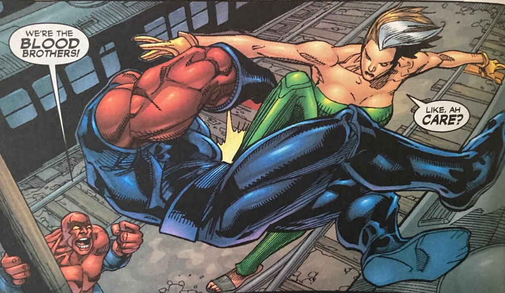 Nate Grey’s rarely had an actual costume and when he has they’ve looked like garbage. Switching to trousers, an open jacket with nothing underneath and a sweet new tat was a good change for him. Steve Pugh’s Generation X uniforms weren’t their best, but he definitely made them look gloriously chaotic and teenage, especially Jubilee.