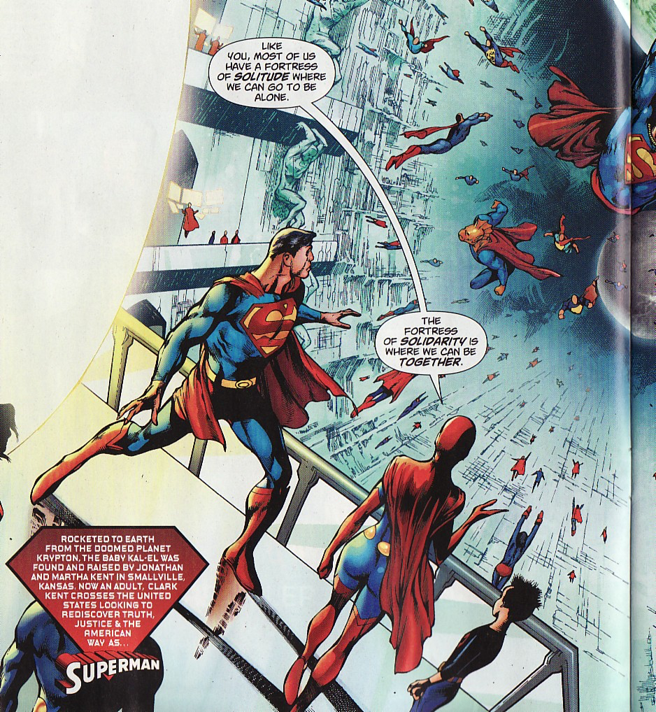 There was an attempt by JM Straczynski to have Superman get ‘Grounded’ and walk across America making very questionable JM Straczynski proclamations. The series itself almost had me bail from the comic until Chris Roberson came on board and in the second half of the arc it was revealed that someone’s misguided vengeance was forcing Superman to be conflicted, filled with doubt and making rubbish choices like supporting polluting companies against protestors because… jobs, I think? It ended with multi-dimensional Supermen creating a “Fortress of Solidarity”, a counter to the Fortress of Solitude. Another moment that had me welling up.
