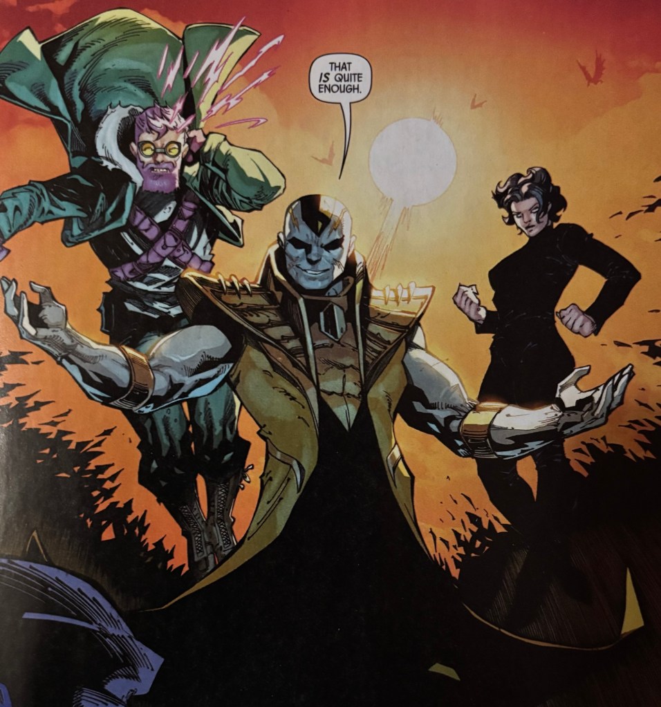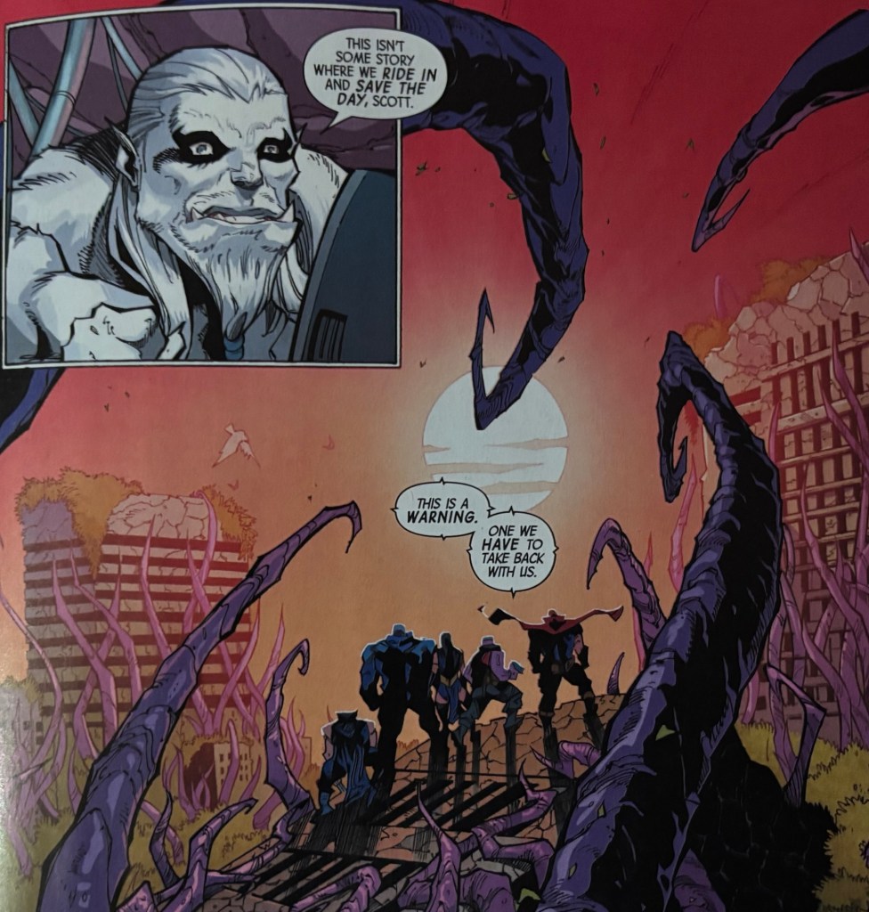 In my self-imposed marathon of reading an X-Men comic (or an arc for a spin-off), I would probably take three weeks to get through this and I don’t know if I can bring myself to do that. I’m already preparing a From the Ashes era emergency stop and pivoting to the Legion of Super-Heroes if it doesn’t buck its ideas up.