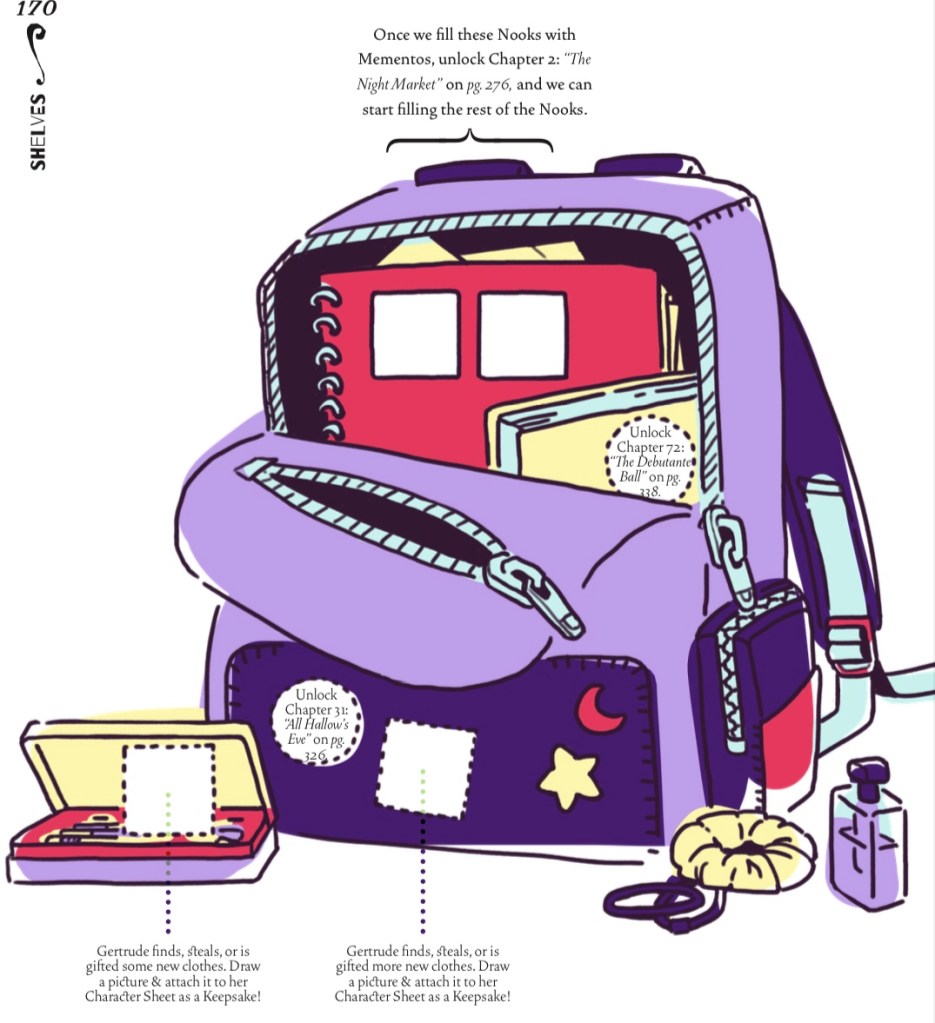 Gertrude’s backpack, slots for stickers and what they unlock.